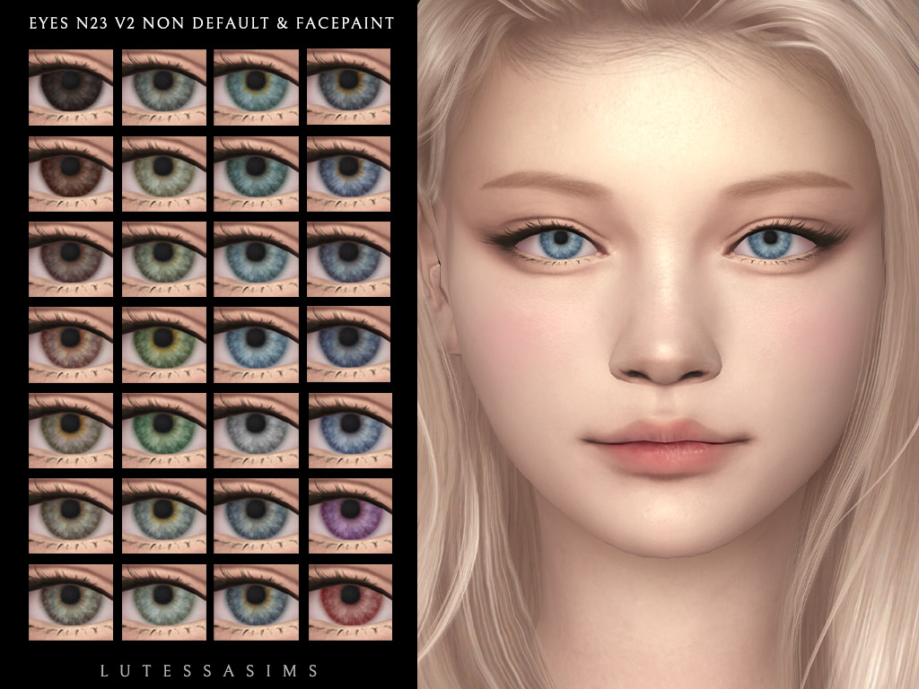 Eye lenses Eyes N23 Non-Default & Facepaint May 18, 2025May 18, 2025 Another version of Eyes N23 but without catchlights. This set includes a non-default and facepaint version. If you want a default version, you can find it here -Female/Male -Infant to Elder -non default / facepaint -28 colors -HQ compatible Download (curseforge) Post navigation Eyes N23 V2 DefaultLisa Eyebrows